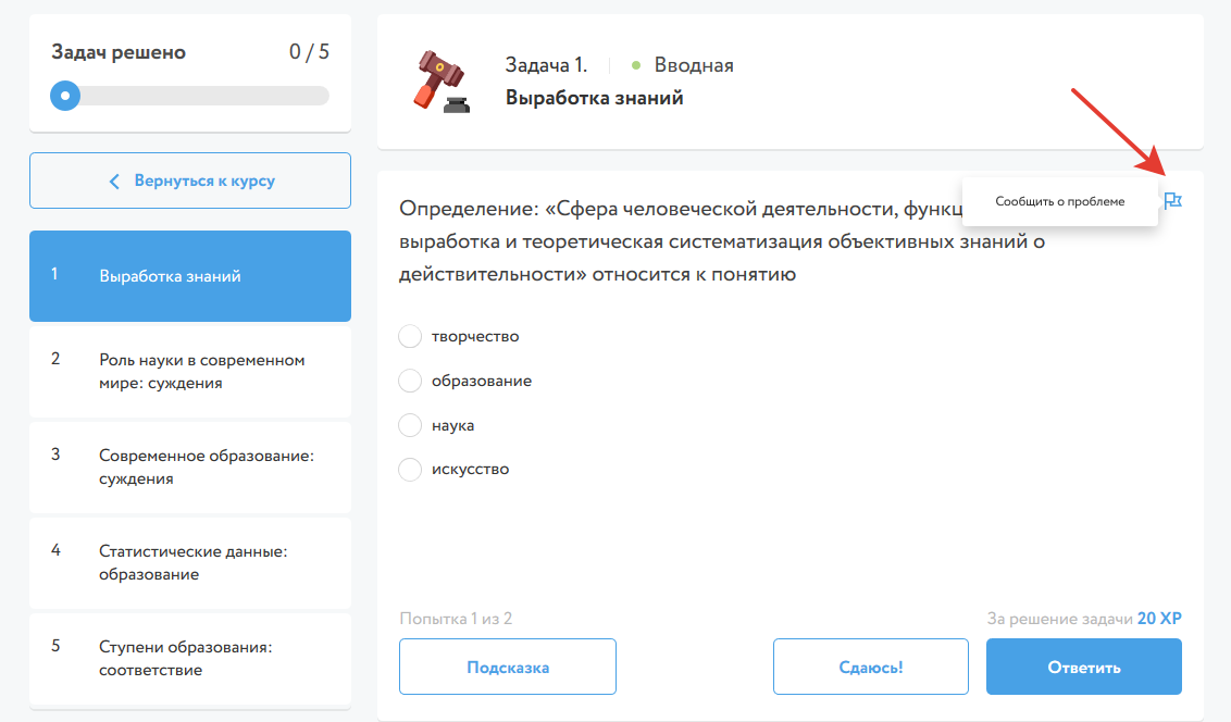 При выполнении любого задания можно нажать на флажок и сообщить о проблеме в учебный отдел.