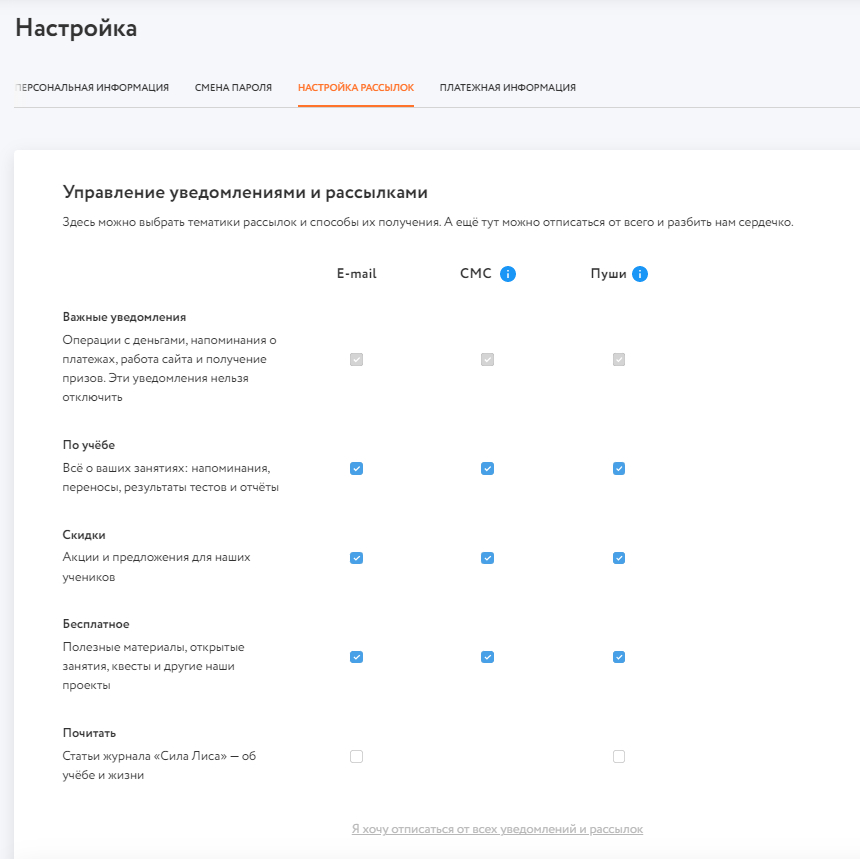 Если вы хотите получать наши письма, проверьте настройки рассылок в личном кабинете. Зайдите в раздел «Настройки профиля», нажав на вашу аватарку и выбрав этот пункт в выпадающем меню. В настройках перейдите на третью вкладку — «Настройка рассылок», в ней удостоверьтесь, что у вас стоят галочки напротив нужных вам рассылок.