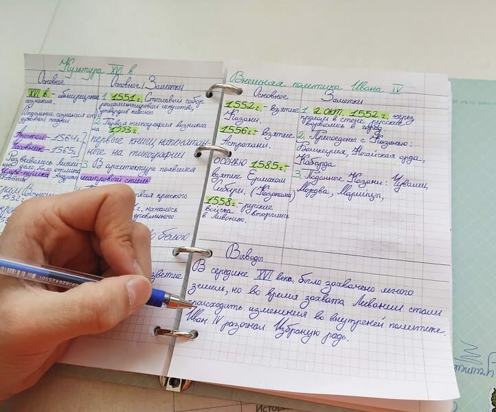 Теоретические материалы — это удобно. Но для лучшего запоминания я веду бумажные конспекты. По всем предметам. Особенно полезно, конспектировать такие гуманитарные предметы, как историю и обществознание. Только чтобы быть активной на уроке и успевать отвечать в чате, делать это нужно правильно.