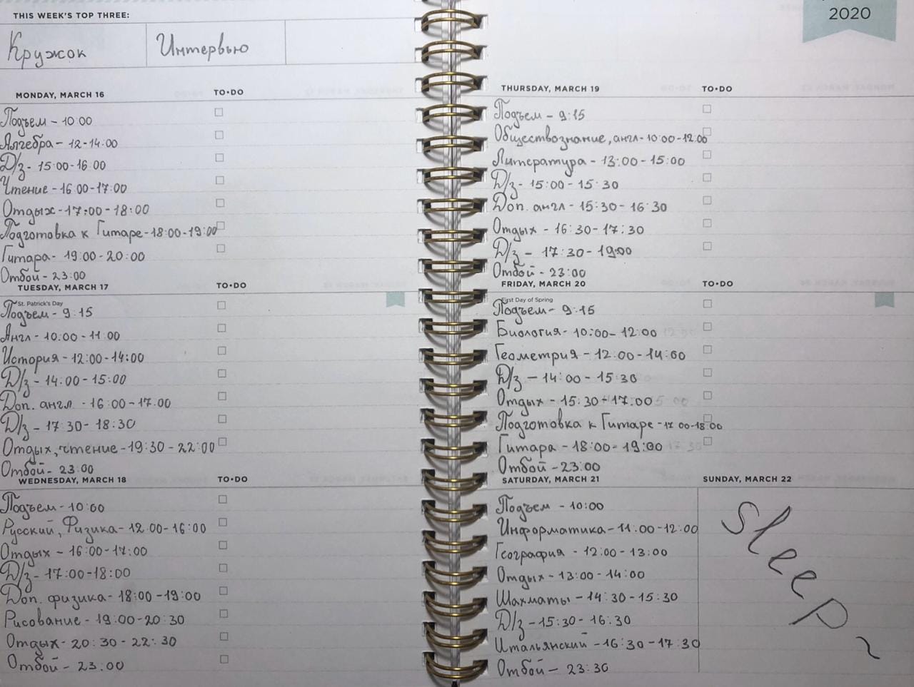 Сейчас я встаю в девять утра, завтракаю и подключаюсь к урокам. Во время онлайн-занятий стараюсь быть максимально сосредоточенной, обязательно записываю важные мысли в тетрадь. Первый месяц я не вела конспекты, и это было ошибкой. Когда подошло время контрольных работ, пришлось пересматривать некоторые уроки. Хорошо, что есть записи, но плохо, что нужно опять тратить время.